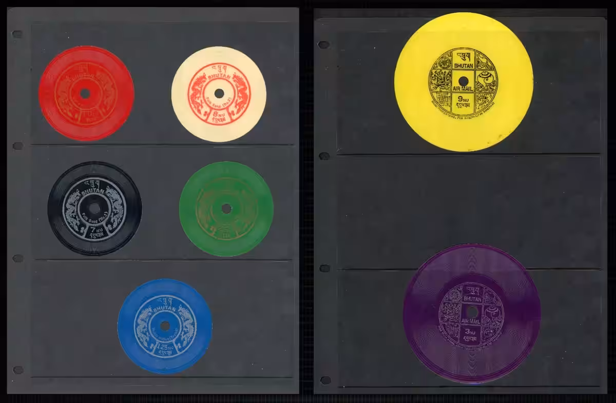 Bhutan, a small Himalayan kingdom, partnered with American adventurer Bert Todd to create seven miniature records pressed as postage stamps. Each played at 33⅓ RPM and featured the national anthem, folk songs, and a brief history of Bhutan narrated by Todd himself, in English and Dzongkha. These ”record stamps” could be stuck on mail and genuinely played on turntables. Postal collectors initially dismissed them as gimmicky, but vinyl collectors later uncovered their rarity-raising their value from about £17 to over £300.
