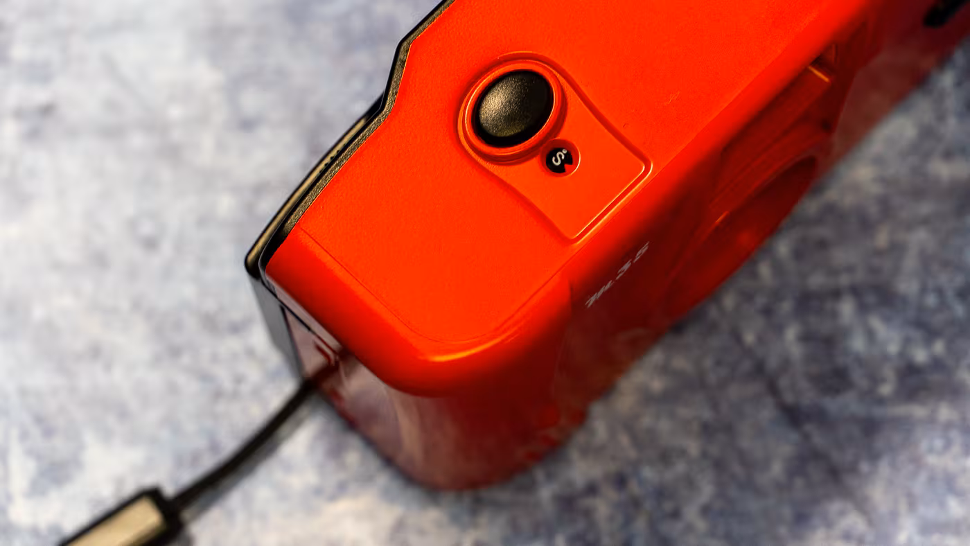 The body is glossy ABS plastic and offers a colorful range that’s part of the appeal: Candy Pink, Flame Scarlet, Yellow, Mint Green, Grapefruit, Lavender, Cerulean Blue, plus subdued options like Clouds White, Olive Green, and Starry Black. Choosing a vibrant hue turns the Kodak M35 into a style statement – basically a photo accessory like a phone case or vinyl record sleeve. After debating between red and blue, I went for a saturated color to brighten up my daily carry.