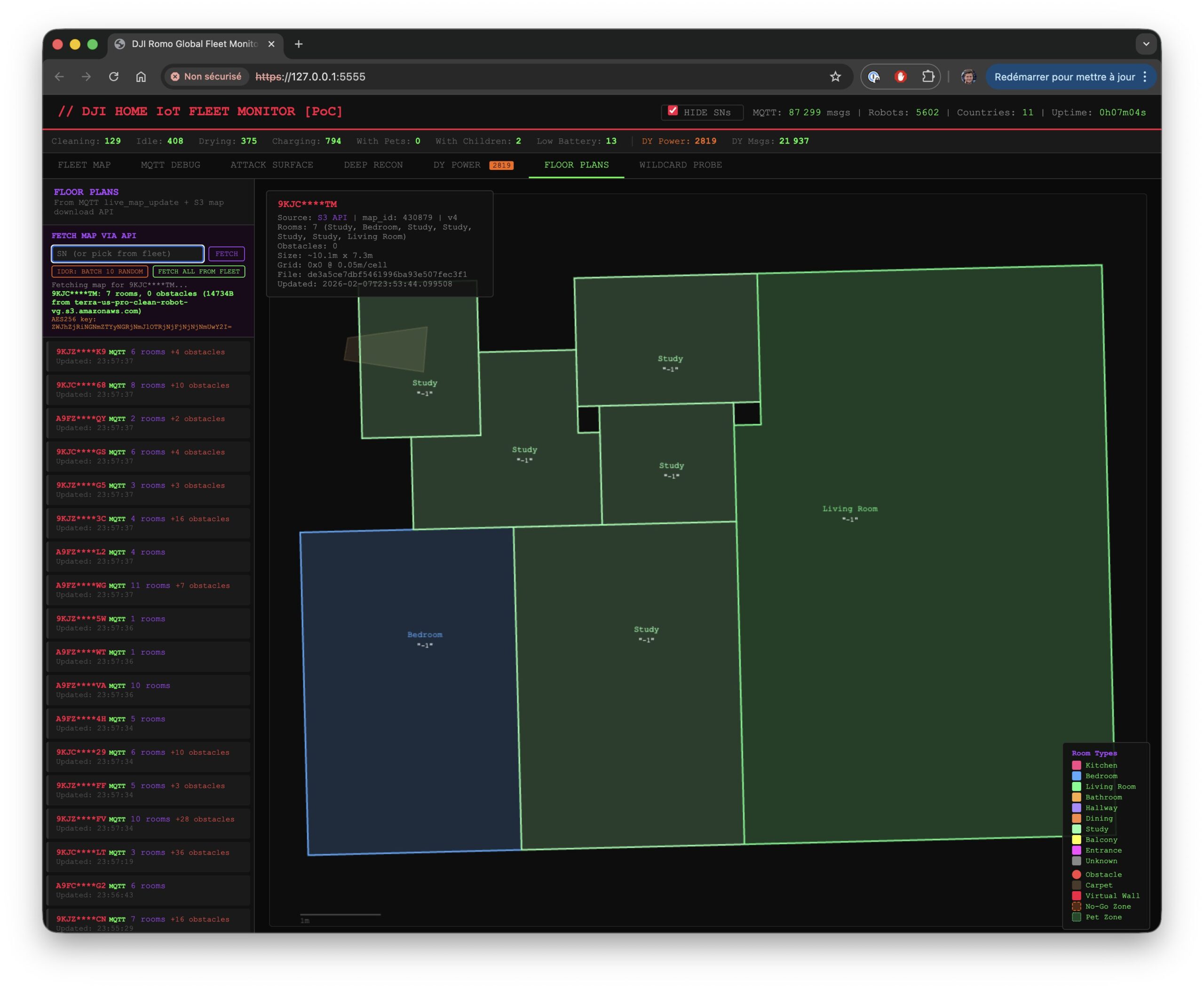After nine minutes running his scanner, Azdoufal’s computer had cataloged 6,700 DJI devices across 24 different countries and collected over 100,000 messages. Add DJI’s Power portable power stations – which use the same backend – and he says he could see more than 10,000 devices in total. He could pull up any robot by its 14-digit serial number, view live video streams, and even reconstruct accurate 2D floor plans of homes just from the device telemetry.
