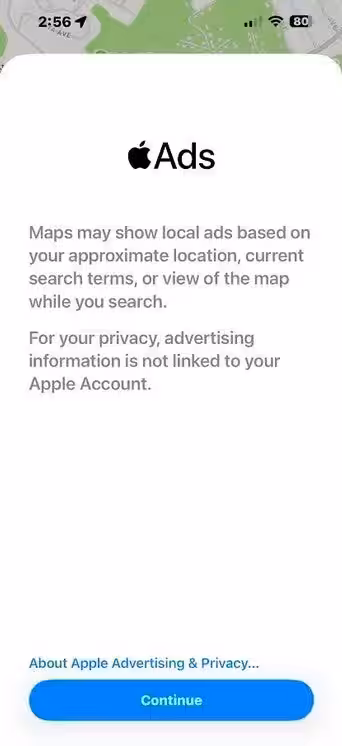Apple is not exactly hiding the business model here. The new popup shown the first time Maps opens after installing the beta explains that advertising information is not linked to an Apple Account, while ads may be based on approximate location, search terms, or even what you are looking at inside Maps. That last part hints at a much more context-sensitive system, the same general direction Apple seems to be taking with Siri.