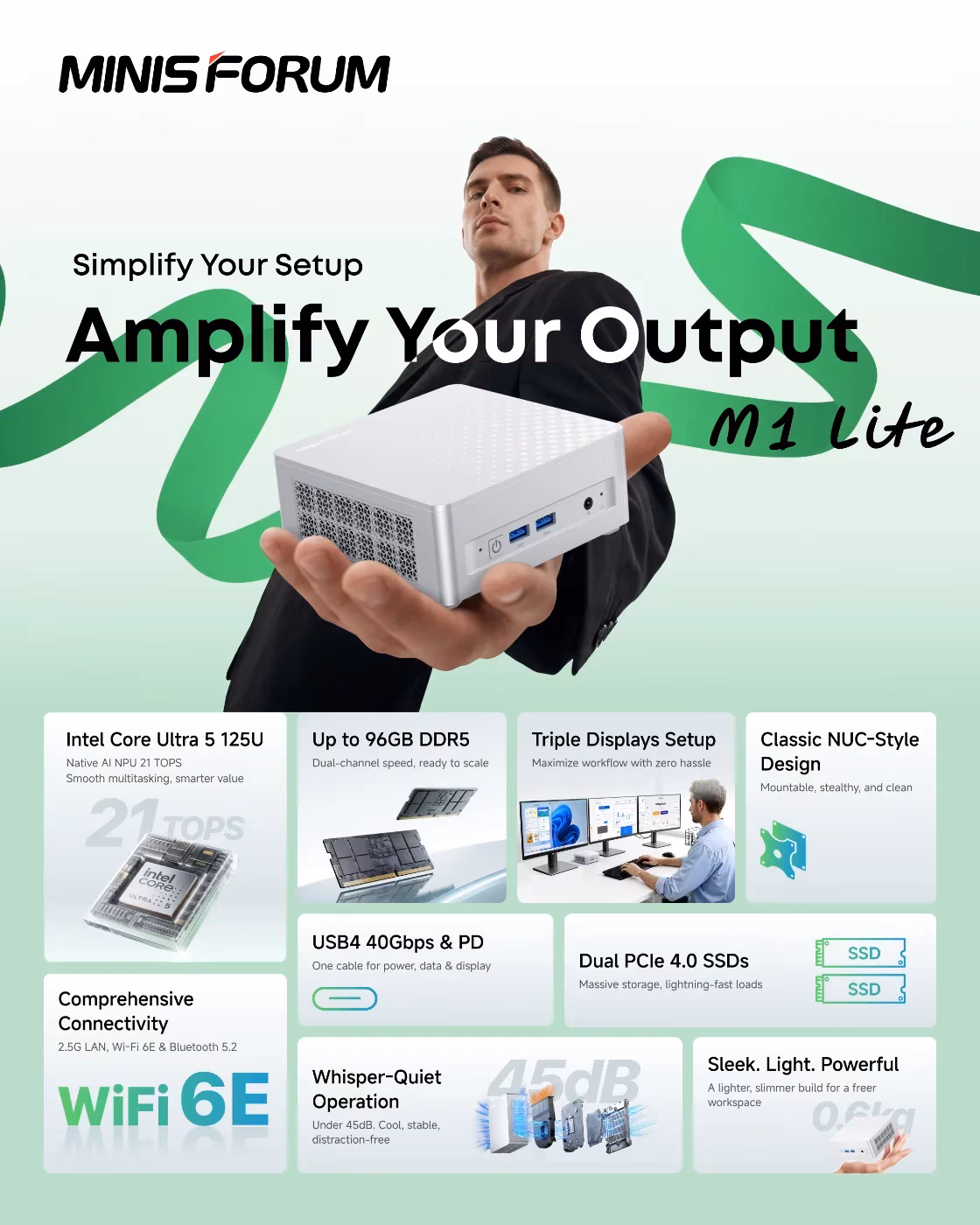 Storage and memory options are generous for a machine this size. The M1 Lite sports two M.2 2280 slots for SSDs and supports up to 96GB of DDR5-5600 RAM across its SODIMM slots. Active cooling keeps the system from overheating while maintaining noise levels below 45 dB, even under full load.