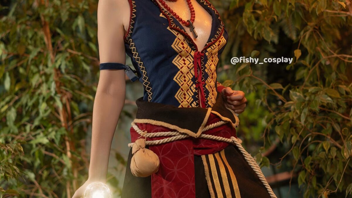 Fishy’s take on Triss features a turquoise and bronze embroidered dress adorned with leaf patterns that looks like it was crafted by a professional costume designer-or a cosplayer obsessed with perfect detail. Her fiery red braids are decorated with golden clips, and the delicate tiara, square pendant necklace, and geometric-patterned stockings all replicate the game’s signature look exactly, leaving no room for improvisation.