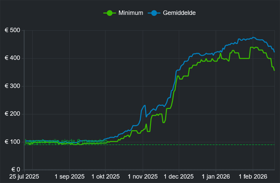 The signal came from enthusiasts: a pricing chart shared on a popular PC community tracked the average price of a 32 GB DDR5 kit across the EU from late July 2025 to February 2026. The chart shows average prices creeping around €95-€100 through early autumn, then a sharp climb starting in October and peaking in early February at roughly €430-€470 on average (with minimum prices slightly lower). Toward the end of the tracked period both average and minimum lines trend downward.