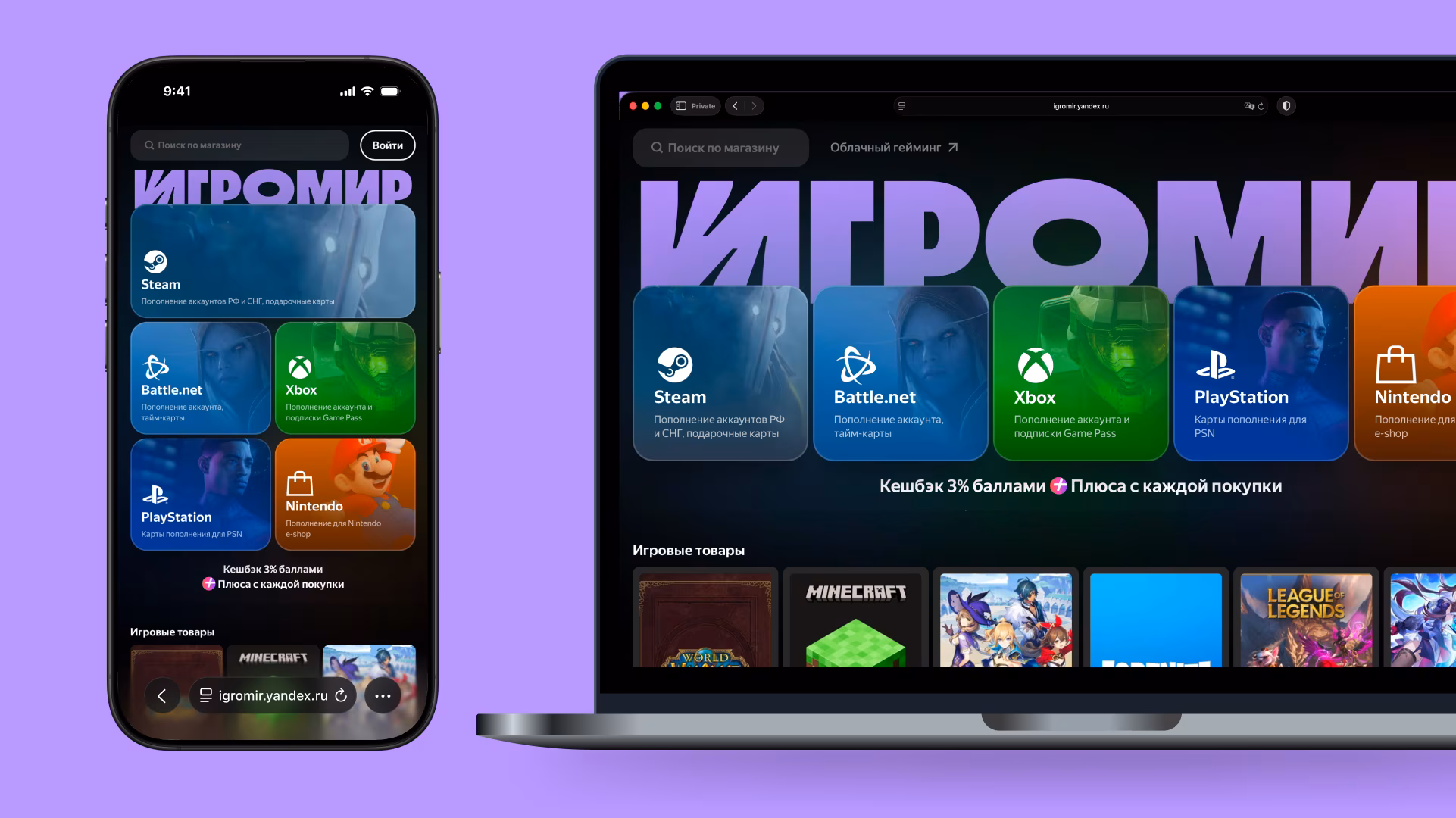 Mobile phone and laptop running Yandex Igromir service